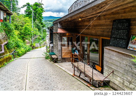 関東・箱根登山電車・あじさい電車が停車する宮ノ下駅の駅前通りの眺め・神奈川県箱根町