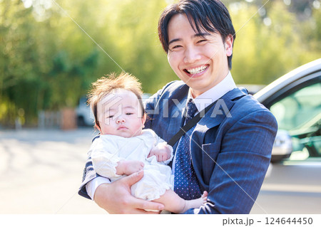 お宮参りで息子を抱き上げ喜ぶ父と子