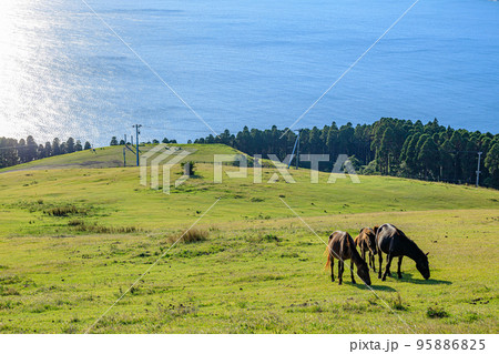 夕日と御崎馬 都井岬 宮崎県串間市