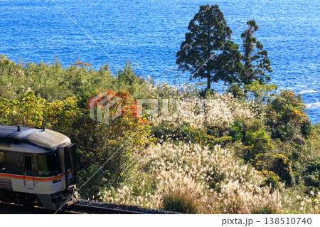 太平洋からの眩しい朝日を浴びて輝くススキを背景に徐福の宮を走り抜ける紀勢本線の気動車