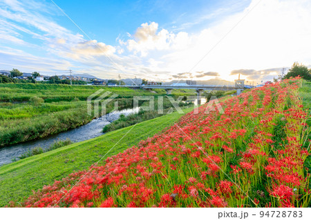 夕日と犬鳴川河川公園の彼岸花 福岡県宮若市