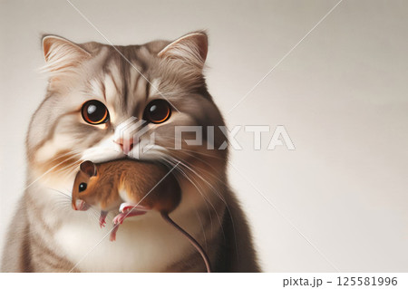 A cat with a caught mouse in its mouth. Space for text.