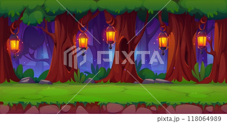 Night forest game landscape with magic lanterns. Cartoon vector dark enchanting wood scene with glowing lamps hanging amidst tall trees, illuminating the path. Magical, fantasy game level background