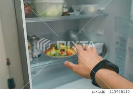 冷蔵庫の冷蔵室ドアを開ける40代男性の手元