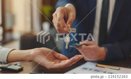 A realtor handing house keys to new homeowner with mortgage agreement on desk, Property ownership celebration concept