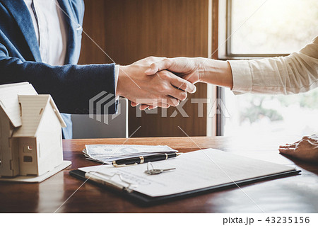 Real estate agent and customers shaking hands together celebrati
