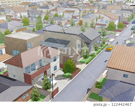 家 住宅 マイホーム 住まい 街 俯瞰 手描き風 水彩画