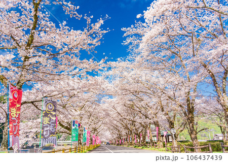 島田市の家山の桜トンネルの桜のある道路の風景(静岡県)