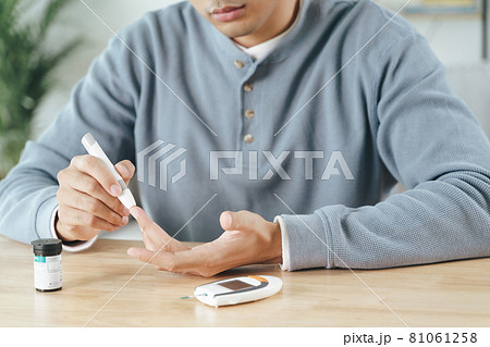 Asian man using lancet on finger for checking blood sugar level by Glucose meter, Healthcare and Medical, diabetes, glycemia concept.
