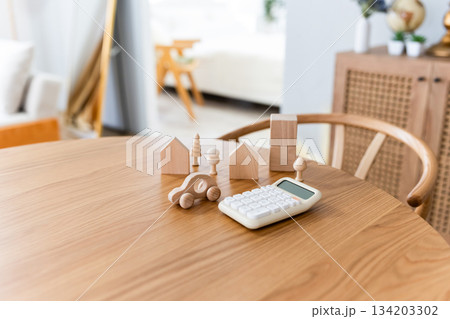 共働きイメージのテキストと電卓、家計や仕事と育児の両立を表すビジネスコンセプト