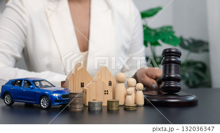 Judge hitting gavel with house family car and coins on table, legal decision and property concept