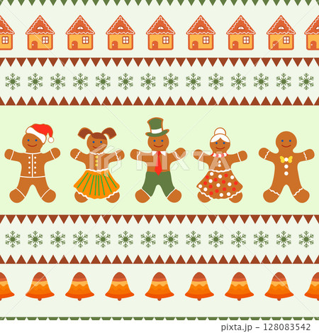 Christmas gingerbread cookies on seamless festive background with bells and snowflakes