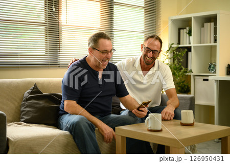 Senior man and his grown son laughing while browsing on a mobile phone in living room. Father day concept