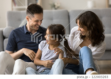 Parents tickling daughter enjoy playtime on family weekend leisure