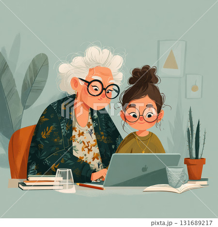 Senior woman teaching granddaughter on laptop at home. Family learning, digital education, and intergenerational connection concept illustration. Vector illustration