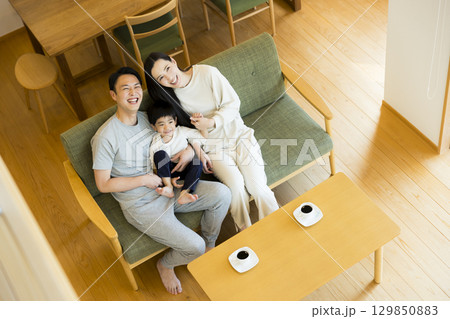 家のリビングでリラックスする日本人家族・ファミリー・親子