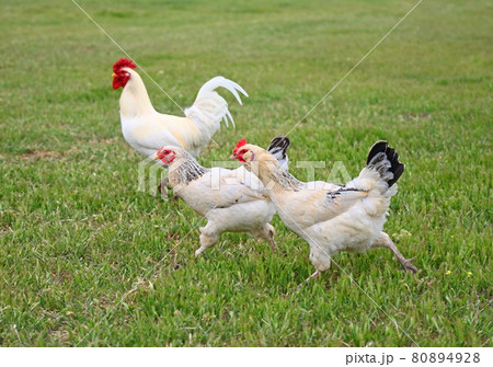 Rooster with chickens graze on the green lawn