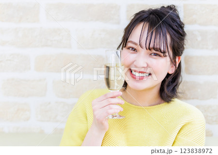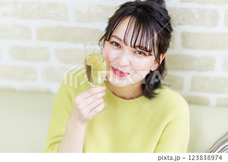 家の寝室で晩酌する若いアジア人女性(ウィスキー,家飲み,飲酒習慣)
