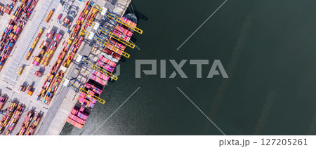 Aerial view container cargo ship at industrial international terminal seaport, Container cargo ship loading and unloading container freight shipping logistic import export, Global business sea