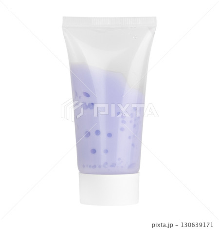 A blank white cosmetic tube with leaves and purple flowers , white background with copy space