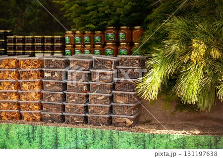 Forestry dried mushrooms in plastic containers at a Christmas rural fair - chanterelles and porcini mushrooms