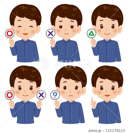 マルとバツなどの札を持った男の子の上半身イラストセット