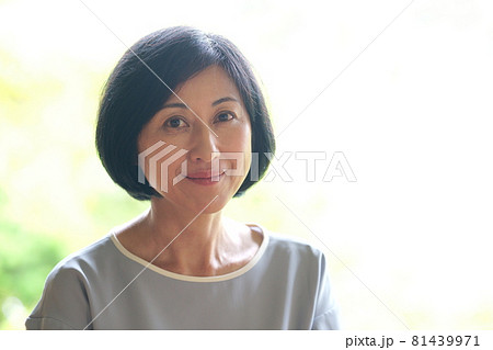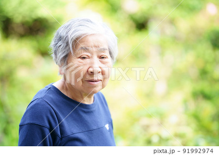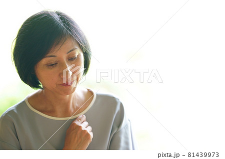 緑の中でTシャツを着て寂しそうに佇む中年女性