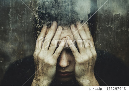 A Person Expressing Distress by Covering Face with Hands Behind a Foggy Glass Surface