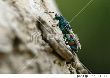 生き物 昆虫 ムツバセイボウ、金属光沢の虹色のハチ。ざらついた肌の粒々が一つづつ輝いています