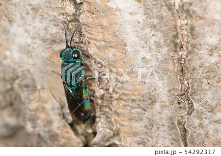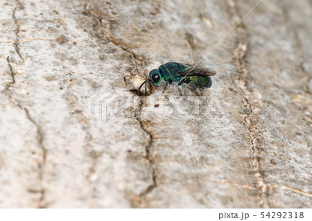 生き物 昆虫 ムツバセイボウ、朽木に開いたオナガバチ類の羽化後の巣穴を丹念にチェック