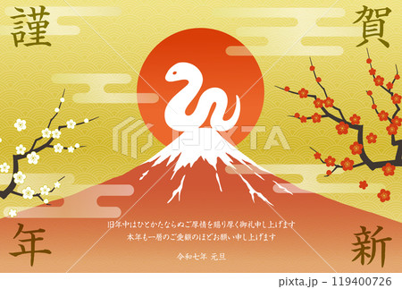 巳年の年賀状テンプレート 富士山と蛇と梅