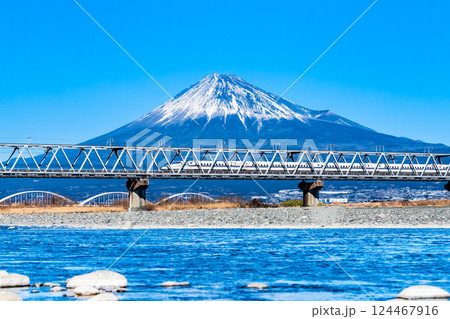 (静岡県)日本三大急流の富士川を渡る新幹線、後方に富士山
