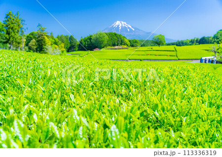 (静岡県)もえぎ色が美しい、富士市・大淵笹場の茶畑越しに富士山