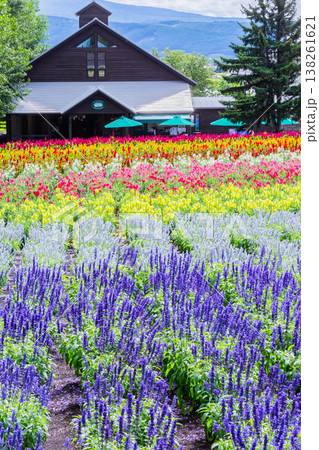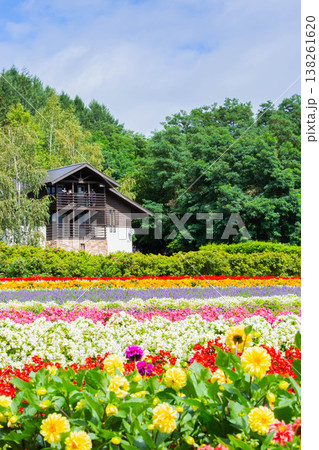 夏の北海道 富良野 ポピーの花畑と白樺の林