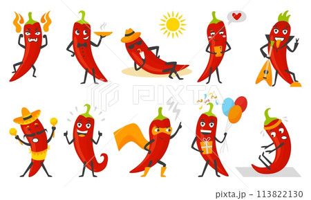 Cartoon peppers characters. Hot paprika, red chili natural spices. Hot mexican vegetable jalapeno wear sombrero. Emotional neoteric vector set
