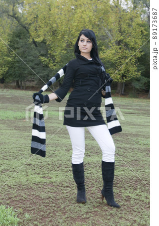 Freezing Female Character Wrapped in Warm Winter Clothes, Hat, Scarf and Mittens Shivering due to Low Degree Temperature