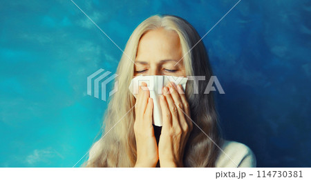 Sick exhausted mature woman sneezing blow nose using tissue at home