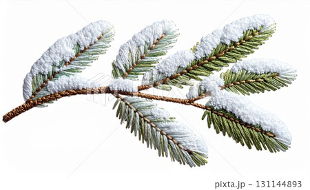 Snow Covered Green Fir Branch on White Background in Winter Season