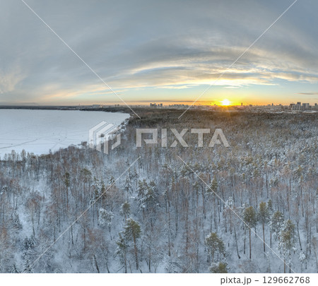 Snow-covered forest on lake shore with ice at sunset and the city on horizon, auerial view