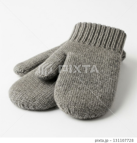 Two Gray Knitted Mittens on a White Background Winter Apparel Still Life Photography