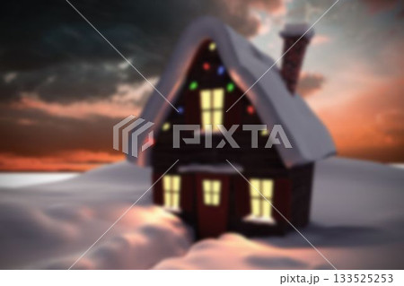 Wooden cabin is sitting in snow field under sunset sky flat design with multicolored string lights