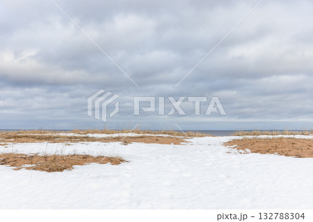 Open coastal landscape showing snowy patches on sandy terrain, calm distant sea