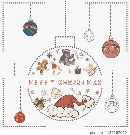 Christmas colored contour illustration in the style of childrens doodles Christmas design elements in a Christmas ball Santa Claus Hat