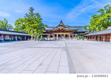 日本の寒川都市景観 相模國一之宮 寒川神社・社務所や納札殿,。緑が多い=令和6年7月21日