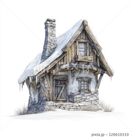 Snow Covered Rustic Wooden Cabin with Icicles Winter Scene