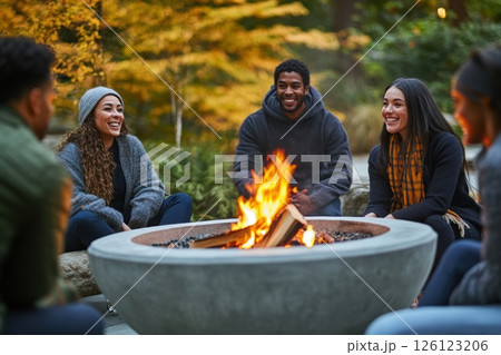 Group of friends enjoying an autumn evening outdoors, sitting around a fire pit, laughing and talking. Cozy atmosphere, warm clothes, and vibrant fall foliage in the background. Copy space. Banner