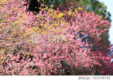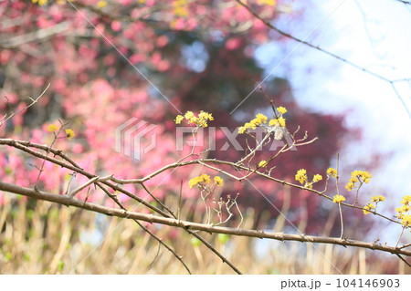 春黄金花 サンシュユの花 背景 寒緋桜