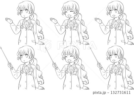 案内する女性医師、指し棒を持つ白衣の女性。説明する若い女性の線画6点セット