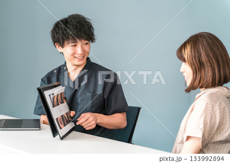 診察を受ける患者の女性と話を聞く医師・医者(早期発見・健康診断・人間ドック・診察・診断・検査)
