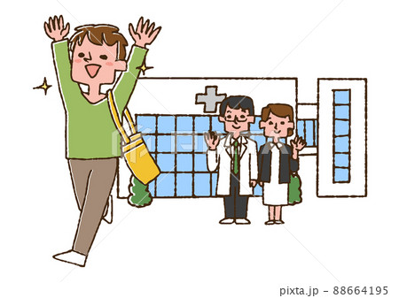 退院した男性と見送る医師と看護師 コミカルな手書きの人物 ベクター、線画にカラー